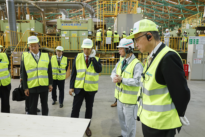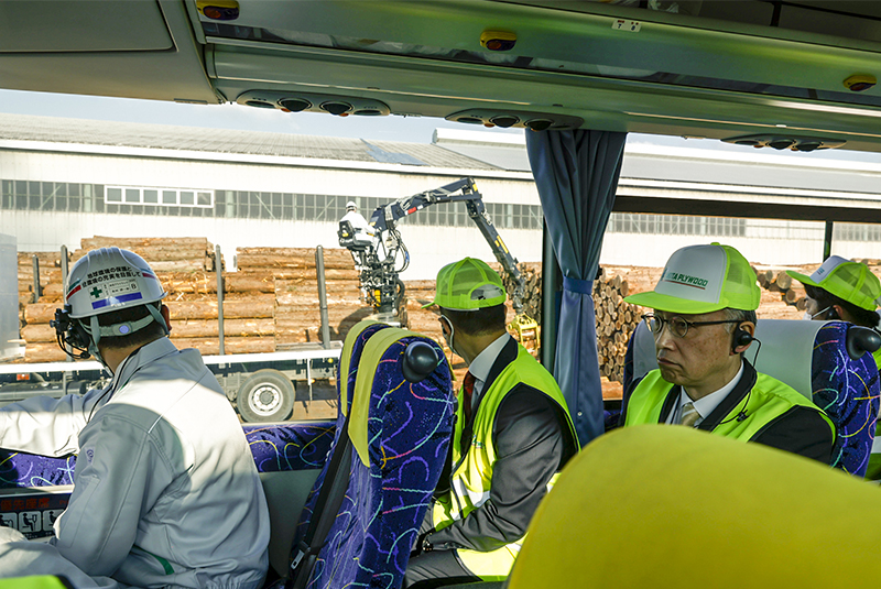 秋田県の森林資源を活用して良い製品を作り続けていくと述べた井上社長 締結式を終えた後はバス2台をチャーターして関係者や報道各社向けの施設見学を実施。原木の貯木場を通過する際に秋田県産材が搬入される量を説明し、エーピーフォーレが収穫した原木の荷下ろし作業を車内から見ていただきながら通過し、第二工場入口で降車しました。