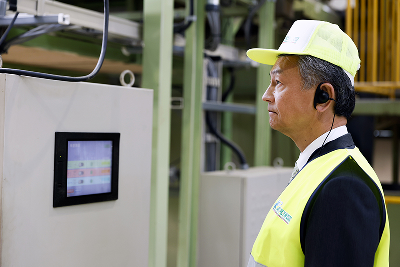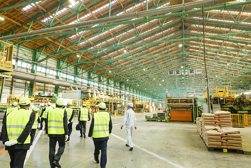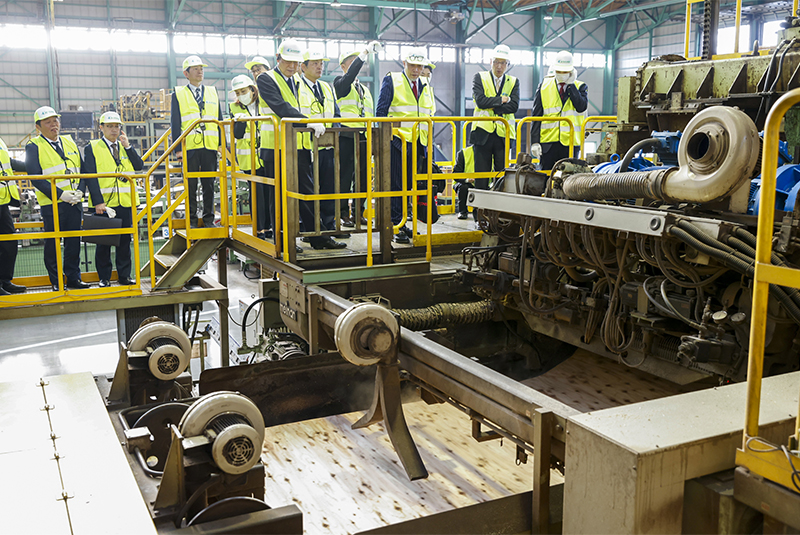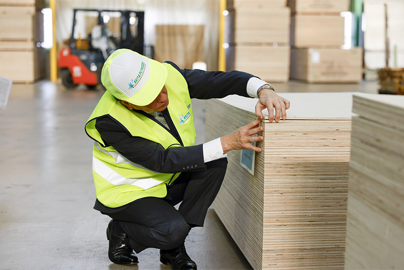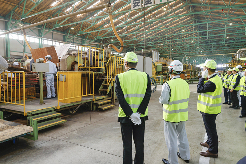 単板を乾燥させる工程では、板に含まれる水分量の測定や板面の選別を行い、安心が担保できる強い合板を作っていることを説明。単板の貼り合わせやプレスの工程、製品検査等、ポイントを説明しながら全体像をご理解いただきました。