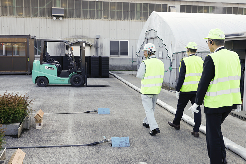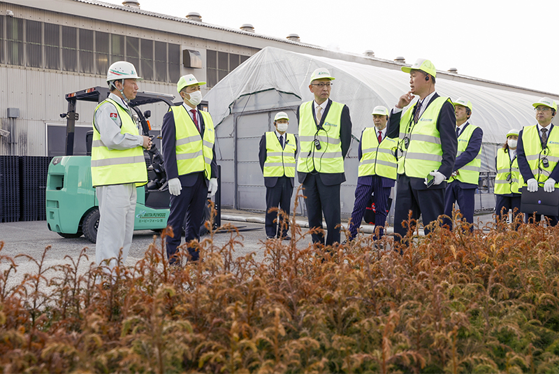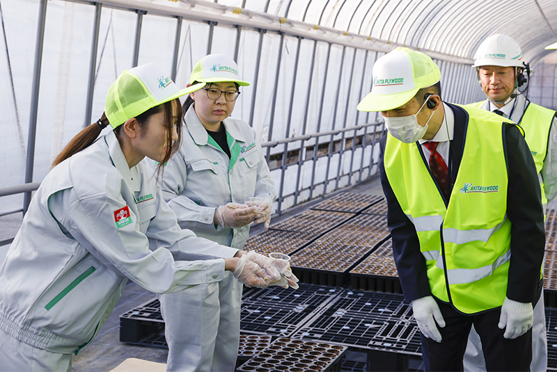 育苗施設(コンテナ苗)においては成長の早いエリートツリーや少花粉スギ、雪害抵抗スギなどの樹種の生育状況を説明。2019年のスタート時点5万本だった種苗本数が今年の生産目標30万本に至った事業の経過を説明しました。育苗ハウス内では毎年4月に本格化するコンテナ苗の播種作業について、当社の森林環境事業を担うエーピーフォーレの社員による作業をご紹介し、当社の事業へ理解をいただきました。