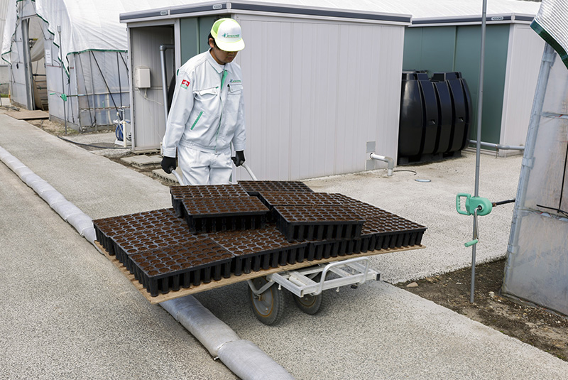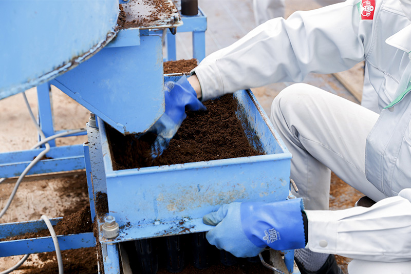 基本となる土づくりは、育苗培土と水を攪はん機によって混ぜ合わせて、樹脂製の多孔容器(マルチ・キャビティー・コンテナ)の40個の孔に入れて苗床とします。コンテナに土をならして充填した後、種まき作業場へと移動します。