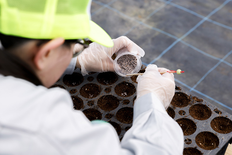 播種作業は1つのポットあたり5粒程度の種を丁寧に蒔いて通気性・保水性が高い鹿沼土を覆土します。土づくりと播種作業はシンプルな作業の積み重ねとなりますが、丁寧かつ迅速に行うことで、発芽率と作業効率の向上を目指しています。
